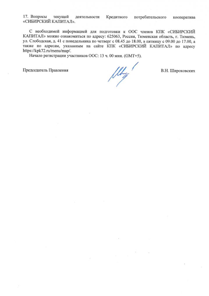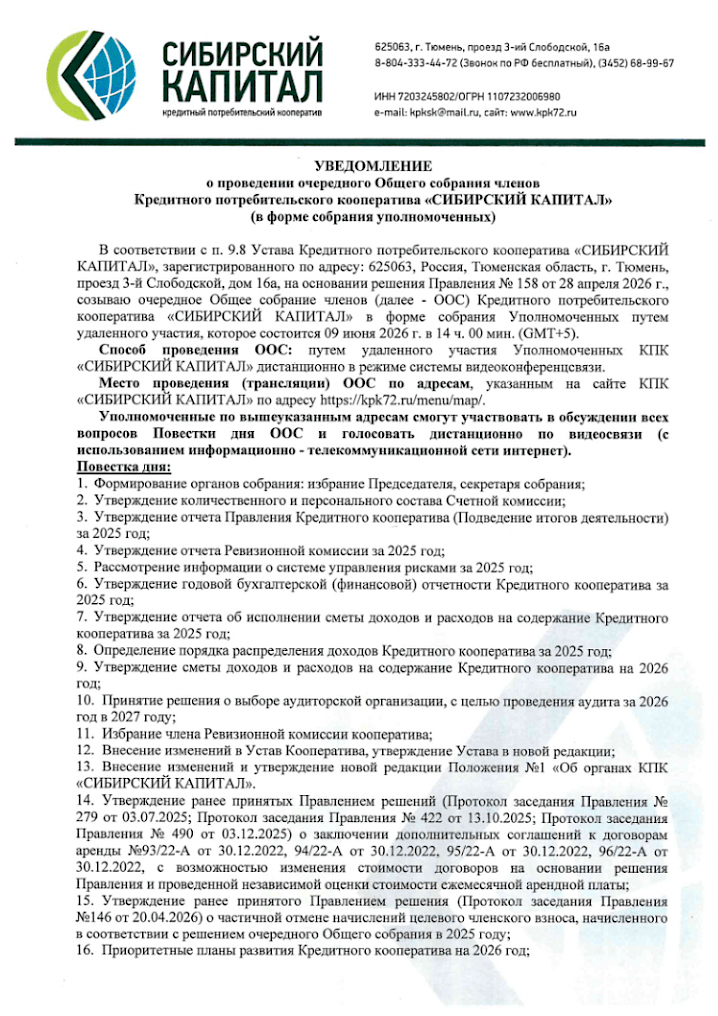 УВЕДОМЛЕНИЕ о проведении очередного Общего собрания членов Кредитного потребительского кооператива «СИБИРСКИЙ КАПИТАЛ» (В форме собрания уполномоченных)