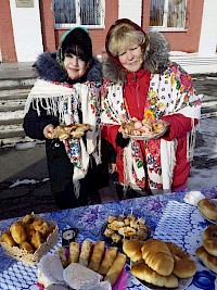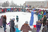Школьники из Любинского с радостью встретили Марфушенку с матушкой, играли с ними в традиционную русскую игру «Ручеек». А косолапый мишка принес на праздник мешок подарков. В конце праздника все дружно отплясывали под русские песни и водили дружный хоровод.