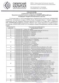 Уведомление о проведении собрания части членов КПК «СИБИРСКИЙ КАПИТАЛ»